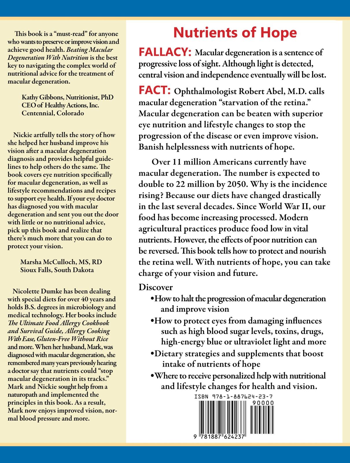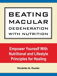 Beating Macular Degeneration With NutritionEmpower Yourself with Nutritional and Lifestyle Principles for HealingBeating Macular Degeneration With Nutrition gets to the root cause of macular degeneration, "starvation of the retina,"[1] as well as other influences on eye health such as ultraviolet and high energy blue light, toxins, drugs, blood sugar control, inflammation and exercise. It contains practical help for improving your nutrition such as 95 recipes, nearly all of which are gluten-free and food allergy friendly yet will be enjoyed by everyone. Also included is a "Sources" section for special foods, products and sources of help. Stop the progression of macular degeneration and save your sight! For a look inside this book, click here.