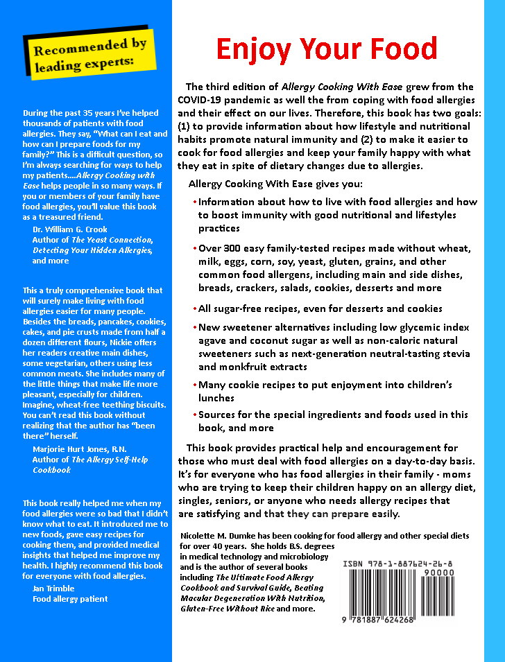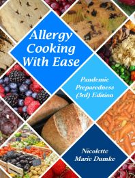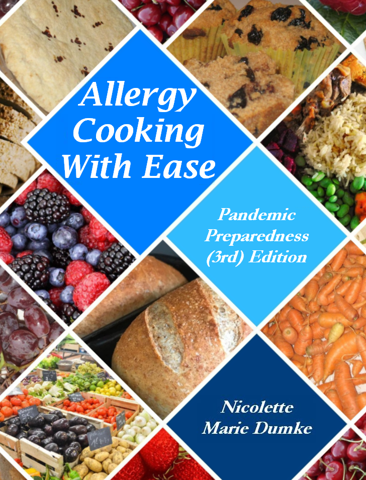 TO PURCHASE Healing Basics from amazon click here. Allergy Cooking With Ease: Pandemic Preparedness (3rd) Edition is a classic all-purpose allergy cookbook for people of all ages with moderate multiple food allergies. It contains over 300 recipes and recipe variations , thus allowing for the use of a variety of grains in the baking recipes. It includes recipes for baked goods, main dishes, soups, salads, vegetables, ethnic dishes, and desserts, including cookie recipes. The dessert and cookie recipes are sweetened with low-glycemic-index sweeteners such as coconut sugar agave or fruit-sweeteners, but a few sugar-sweetened. Allergy Cooking With Ease book was the outgrowth of having a child with multiple food allergies, so the many of recipes appeal to the young and young at heart. It features kid- special recipes such as a recipe for four varieties of teething biscuits. The "Cookies" chapter contains over 45 varieties of cookies including grain-free or grain-containing cookies that are a lot like Oreos.TM Although several grain varieties are given for most of the baking recipes to give options for a rotation diet, this book is not all business. It contains many "fun" recipes as well. If you want to make your allergy diet a little more light-hearted, this is the book for you! Includes an extensive "Sources" section. For a look inside this book, click here.