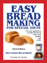Easy Breadmaking for Special Diets, 3rd edition, contains recipes for sourdough breads made with a new wheat- and gluten-free freeze-dried sourdough bread culture. With this new culture, for the first time, sourdough breads can be made reliably in a programmable bread machine, saving you time. The acidity of assertively sour sourdough bread gives it a lower glycemic index than other types of bread made with the same grain. This makes this sourdough an ideal bread choice for an eating plan that controls blood sugar and insulin levels for weight loss as well as being helpful for cancer patients. For more information about the book (including a look inside), click here.