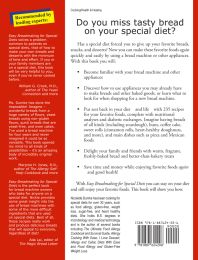 Easy Breadmaking for Special Diets contains over 235 recipes for allergy, heart healthy, low fat, yeast-free, diabetic, and gluten-free diets. It includes recipes for breads of all kinds (including machine-made sourdough – several varieties of wheat- and gluten-free sourdough and some made with wheat), bread and tortilla based main dishes, and desserts. The allergy recipes are made with a wide variety of grains such as spelt, rice, rye, kamut, amaranth, barley, buckwheat, oat, and quinoa and include yeast breads, non-yeast breads, and tortillas. The book discusses what features to look for when you buy a bread machine and how to choose the machine that best meets your needs. If you are struggling to find enough time to make special bread, this book can be a lifesaver.