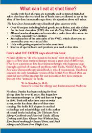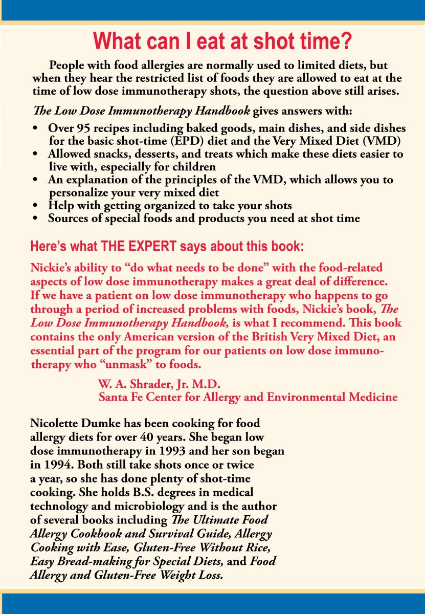 The book provides 84 recipes to help patients on low dose immunotherapy know what to eat around the time of the treatments and how to prepare these foods. The recipes include 39 for the shot-time or EPD diet made only with the foods allowed during the critical period, 9 recipes for "eating exotic" around your shots, and 36 recipes for the very mixed diet. It also includes organizational information and a sample "to do list" to help you get ready for your shots.